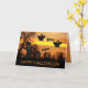 Cartão de Halloween com imagem com silhuetas pretas de fantasmas assustadores, morcegos, lápide, aranha, árvore sinistra e mais na noite de Halloween. Selecione o tipo de papel do cartão de saudação.