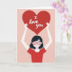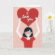 This design shows a stylized woman centered on a pastel pink background, holding her arms out as she presents a huge crimson heart above her. The heart fills the upper part of the card and carries the words “I love you” in white lettering, making the message easy to spot at a glance ❤️. Her eyes are gently closed and she wears a wide smile with a soft blush, giving the scene a tender, affectionate feel 🥰. She has a neat black bob haircut and red-framed glasses that add a friendly, approachable character. The lighting looks soft and even, with minimal shadow, so the reds and pinks feel warm without being harsh. The layout is balanced and centered, drawing your gaze from her face up to the heart and then to the text. The large red heart sits above her hands, with the white “I love you” text centered inside it against the pink backdrop.