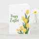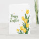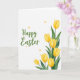 Designed with a bright spring layout, this Easter card features a white background split into a text side and a floral side 🌷. On the left, a flowing seasonal greeting sits in medium-to-dark green, with the words stacked in a gentle vertical balance and plenty of open space around them. On the right, seven yellow blossoms rise from the lower corner toward the upper edge, their petals shaded like soft watercolor and their deep green leaves curving close as if sheltering one another. The blooms cluster tightly near the base and then fan out upward, giving the arrangement a friendly, almost companionable closeness. Small golden starburst accents are sprinkled across the white space, gathering near the green lettering and drifting between the upper flowers for a light sparkle 🐇. The contrast between the sunny petals and the crisp background keeps every detail easy to notice, from the leaf veins to the soft edges of the paint-like texture. A few of the tiny golden bursts hover just above the top blossoms and beside the left-aligned green greeting.