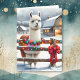 Cartão de Natal quadrado personalizado com tema de fazenda. Uma fazenda vintage com uma lhama em pé do lado de fora em um dia de inverno nevado.