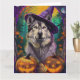 Cartão Feiticeira do Dia das Bruxas Malamute e Abóbora do