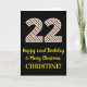A frente deste simples e divertido cartão de saudação de aniversário de 25 de dezembro, com tema natalício e tema de aniversário, apresenta um grande número "22" com um padrão de listras vermelho/branco/verde, juntamente com a mensagem "Feliz 22º aniversário e Feliz Natal", e um nome editável. O fundo da frente é preto colorido. O dentro apresenta uma mensagem de saudação de aniversário personalizada, ou talvez possa ser apagado e deixado o vazio se uma mensagem for escrita manualmente. Um cartão de aniversário personalizado como este pode ser uma maneira divertida de enviar uma mensagem em comemoração do vigésimo segundo aniversário de alguém que também cai na 25 de dezembro (Dia de Natal). [~Z0000405]