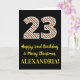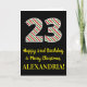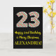 A frente desta divertida e simples carta de saudação de aniversário de 25 de dezembro do templo Natal e tema de aniversário apresenta um grande número "23", com um padrão verde/branco/listras vermelhas. Também apresenta a mensagem "Feliz 23º aniversário e Feliz Natal", e um nome personalizado. O fundo da frente é preto colorido. O dentro apresenta uma mensagem de saudação de aniversário personalizada, ou talvez possa ser apagado e deixado o vazio se uma mensagem for escrita manualmente. Um cartão de aniversário como este pode ser uma maneira divertida de enviar desejos de aniversário a alguém que comemora seus vinte e três anos e que também foi nascer no Dia de Natal (25 de dezembro). [~Z0000405]