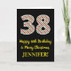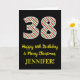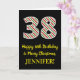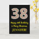 A frente desta divertida e simples carta de saudação de aniversário de 25 de dezembro, temerária de Natal e tema de aniversário, apresenta um grande número "38" com um padrão verde, branco e vermelho de listras, juntamente com a mensagem "Feliz 38 de aniversário e Feliz Natal", e um nome personalizável. O fundo da frente é preto colorido. O dentro apresenta uma mensagem de saudação de aniversário personalizada, ou talvez possa ser apagado e deixado vazio se uma mensagem for escrita manualmente. Um cartão de aniversário personalizável como este pode ser uma maneira divertida de enviar uma mensagem em comemoração do trigésimo oitavo aniversário de alguém que também cai na 25 de dezembro (Dia de Natal). [~Z0000405]