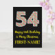 A frente desta divertida e simples carta de saudação de aniversário de 25 de dezembro, com tema de Natal e tema de aniversário, apresenta um grande número "54" com um padrão verde/branco/vermelho de listras, juntamente com a mensagem "Feliz 54º aniversário e Feliz Natal", e um nome personalizado. O fundo da frente é preto colorido. O dentro apresenta uma mensagem de saudação de aniversário personalizada, ou talvez possa ser apagado e deixado vazio se uma mensagem for escrita manualmente. Um cartão de aniversário personalizável como este pode ser uma maneira divertida de reconhecer o cinquenta e quarto aniversário de alguém que também cai na 25 de dezembro (Dia de Natal). [~Z0000405]