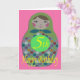 Cartão de aniversário de 5 com imagem de uma Doll Russa em forma clássica, com círculos coloridos, num fundo cor-de-rosa.