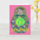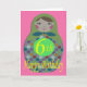 Cartão de aniversário de 6 com imagem de uma Doll Russa em forma clássica, com círculos coloridos, num fundo cor-de-rosa.