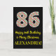 A frente deste simples e divertido cartão de saudação de aniversário de 25 de dezembro, com tema natalício e tema de aniversário, apresenta um grande número "86" com um padrão vermelho, branco e verde de listras, juntamente com a mensagem "Feliz 86.º aniversário e Feliz Natal", e um nome personalizável. O fundo da frente é preto colorido. O dentro apresenta uma mensagem de saudação de aniversário personalizada, ou talvez possa ser apagado e deixado vazio se uma mensagem for escrita manualmente. Um cartão de aniversário personalizado como este pode ser uma maneira divertida de enviar uma mensagem em comemoração do oitenta e seis anos de alguém que também cai no Dia de Natal (25 de dezembro). [~Z0000405]