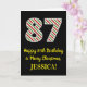 A frente desta divertida e simples carta de saudação de aniversário de 25 de dezembro do templo Natal e do aniversário apresenta um grande número "87", com um padrão verde, branco e vermelho de listras. Também apresenta a mensagem "Feliz 87º aniversário e Feliz Natal", e um nome personalizado. O fundo da frente é preto colorido. O dentro apresenta uma mensagem de saudação de aniversário personalizável, ou talvez possa ser apagado e deixado o vazio se uma mensagem for escrita manualmente. Um cartão de aniversário personalizável como este pode ser uma maneira divertida de enviar desejos de aniversário a alguém que comemora seu oitenta e sétimo aniversário e que também foi nascer no 25 de dezembro (Dia de Natal). [~Z0000405]