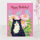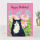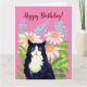 Feliz cartão de aniversário com um gato preto e branco de cabelos longos. Para amantes de gatos e donos de gatinhos!