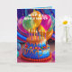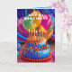 Feliz cartão de aniversário com um bolo colorido, balões, velas e confete. Adicione sua saudação pessoal para personalizar.