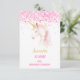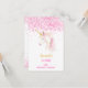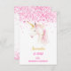 Um cartão de saudação de monocórnio e confetti rosa. Fundo branco. Personalize e adicione um nome, idade e de quem ele é. Voltar: Espaço para você escrever manualmente.