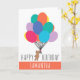 Um ursinho marrom está segurando um grande grupo de balões coloridos e flutuando no céu. Personalize este cartão de "Parabéns" com o nome do destinatário sortudo.