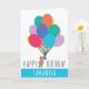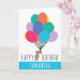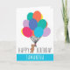 Um ursinho marrom está segurando um grande grupo de balões coloridos e flutuando no céu. Personalize este cartão de "Parabéns" com o nome do destinatário sortudo.
