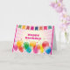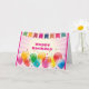 Feliz Aniversário saudando com um dentro de mensagem. Os raios de sol cor-de-rosa enchem o fundo. Balões e uma faixa festiva criam uma atmosfera festiva alegre.
