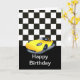 Cartão Feliz aniversário com carro de corrida amarelo