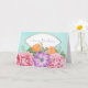 Um cartão de saudação de aniversário feliz com um dentro de mensagem que pode ser personalizado, alterado ou deixado como está. O design é um belo buquê de flores de aquarela, formadas por pedras cor-de-rosa, anêmonas roxas e tulipas laranja cercadas por folhas verdes. Um quadro oval rico com uma borda dourada diz Feliz dentro de Aniversário. O fundo é uma textura macia de cor verde-aquática.