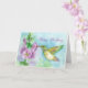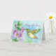 Um cartão de saudação de aniversário macio e bonito, decorado com um beija-flor, visitando algumas flores colírio cor-de-rosa-lavanda pintadas em aquarela.