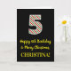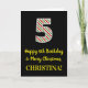 A frente deste simples e divertido cartão de saudação de aniversário de 25 de dezembro, com tema natalício e tema de aniversário, apresenta um grande número "5" com um padrão vermelho, branco e verde de listras, juntamente com a mensagem "Feliz aniversário do 5 e Feliz Natal", e um nome personalizado. O fundo da frente é preto colorido. O dentro apresenta uma mensagem de saudação de aniversário personalizada, ou talvez possa ser apagado e deixado vazio se uma mensagem for escrita manualmente. Um cartão de aniversário personalizado como este pode ser uma maneira divertida de enviar desejos de aniversário a alguém que comemora seu quinto aniversário e que também foi nascer no Dia de Natal (25 de dezembro). [~Z0000405]