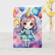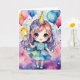 Uma ilustração colorida com aquarela de uma menina de olhos largos com cabelo fluido do arco-íris, vestindo um vestido azul e verde com o número "5". Ela segura um balão amarelo e veste uma festa listrada de ouro que adorava com flores azuis. O fundo está cheio de balões vibrantes e pedaços festivos de cor em tons roxos, roxos e azuis, criando uma alegre cena de aniversário.