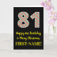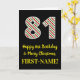 A frente desta divertida e simples carta de saudação de aniversário de 25 de dezembro, tema de Natal, apresenta um grande número "81" com um padrão verde/branco/vermelho de listras, juntamente com a mensagem "Feliz aniversário de rua 810 e Feliz Natal", e um nome personalizado. O fundo da frente é preto colorido. O dentro apresenta uma mensagem de saudação de aniversário personalizada, ou talvez possa ser apagado e deixado o vazio se uma mensagem for escrita manualmente. Um cartão de aniversário personalizado como este pode ser uma maneira divertida de enviar desejos de aniversário a alguém que comemora o seu oitenta aniversário e que também foi nascer no 25 de dezembro (Dia de Natal). [~Z0000405]