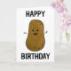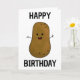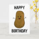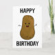 Batata de desenho animado marrom, branca, com braços de palitos, um sorriso feliz e pontos para os olhos. Na frente do cartão, lê-se "Parabéns" em texto preto. Dentro a placa é uma modelo para adicionar sua própria mensagem para personalizar.