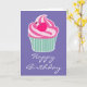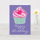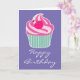 Um belo cartão de aniversário feliz. Arte gráfica / ilustração de um cupcake cor-de-rosa brilhante com espirais de gelo em cima e uma cereja bolinhas rosa-quente e giro. A base é verde e listras brancas. O fundo é roxo.