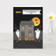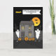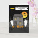 Uma simples ilustração de uma casa assombrada à noite, cheia de fantasmas, abóboras, morcegos e ossos. Um avião sobrevoa a casa e tem um cartaz atrás dele que diz "Feliz aniversário de Hallloween para um filho muito especial".
