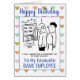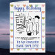 Cartoon Bancário do Funcionário. Máquina de pontos de caixa ri de um cliente. Personalize com a sua escolha de texto e mensagem dentro. Cartão de aniversário para um trabalhador bancário ou caixa de banco.