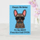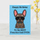 Frenchies, mostre ao seu Pai um pouco de amor no seu aniversário com um cartão personalizado de você. A mensagem na frente do cartão diz "Parabéns ao Melhor Pai Francês de Todos!" A mensagem dentro diz "Eu te amo mais do que guloseimas, Feliz Aniversário." A design apresenta uma ilustração do estilo de desenho animado de um buldogue francês, castanho-macho e cor-de-rosa, vestindo um colarinho azul e óculos escuros do aviador preto. A cor da fonte e do plano de fundo e ser alterada selecionando "Clique para personalizar mais".