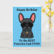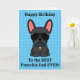 Frenchies, mostre ao seu Pai um pouco de amor no seu aniversário com um cartão personalizado de você. A mensagem na frente do cartão diz "Parabéns ao Melhor Pai Francês de Todos!" A mensagem dentro diz "Eu te amo mais do que guloseimas, Feliz Aniversário." O design apresenta uma ilustração fofinha do estilo cartoon de um buldogue francês de cor preta, vestindo um colarinho azul e óculos escuros do aviador preto. A cor da fonte e do plano de fundo e ser alterada selecionando "Clique para personalizar mais".