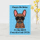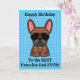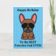 Frenchies, mostre ao seu Pai um pouco de amor no seu aniversário com um cartão personalizado de você. A mensagem na frente do cartão diz "Parabéns ao Melhor Pai Francês de Todos!" A mensagem dentro diz "Eu te amo mais do que guloseimas, Feliz Aniversário." O design apresenta uma ilustração fofa do estilo cartoon de um buldogue francês, de cor vermelha, vestindo um colarinho azul e óculos escuros do aviador preto. A cor da fonte e do plano de fundo e ser alterada selecionando "Clique para personalizar mais".