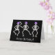 Este cartão é para a pessoa que faz aniversário no Dia das Bruxas para com ela um Feliz Aniversário. Três esqueletos estão dançando um jig em um fundo preto na frente do cartão com as palavras "Feliz Aniversário". As palavras na frente e na dentro podem ser personalizadas para suas próprias palavras. Um esqueleto de dança de solteiro é dentro da placa com saudação personalizável. A mão pintou a arte original apresenta esqueletos dançantes com chapéu roxo nos crânios e está nas cores preto e branco com roxo. Procure meus outros produtos com esta arte para produtos de luxo para o Dia das Bruxas, incluindo convites, cartões de saudação, camisetas, capas eletrônicas e muito mais. Totalmente personalizável para personalização. A arte original é de Phyllis Dobbs que deseja um feliz e brilhante Dia das Bruxas.