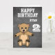 Um brinquedo de ursinho de peluche castanho num quadro de cinzas. Um cartão de segundo aniversário divertido para um menino ou uma menina na sua vida com o nome dele na frente do cartão. Personalize o nome e o número da idade. Um texto de aniversário feliz é perfeito para desejar a um menino ou a uma garota feliz aniversário. O texto está em branco.