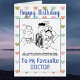 O médico está dormindo na cama do hospital do paciente. Feliz cartão de aniversário do Doutor. Personalize com seus próprios detalhes e mensagem. Diga Feliz Aniversário ao seu GP com este cartão engraçado.