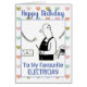 Um desenho eletrônico. Elétrico está trabalhando em alguma fiação. Personalize com seus próprios detalhes e mensagem. Cartão de aniversário para um eletricista.