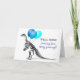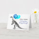 Engraçado cartão de aniversário moderno, com um carregando de dinossauro esquelético, alguns balões azuis com a legenda "BEM FEITO - por ter sido nascer há muitos anos!". Dentro a mensagem diz Feliz Aniversário. Todo texto pode ser personalizado.