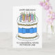 Um grande bolo de desenho animado com um arco azul à sua volta, acompanhado do texto "Feliz aniversário a uma maravilhosa futura mãe em direito".