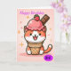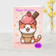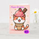 Um gato feliz em um cone de sorvete com o sorvete na cabeça, o sorvete é de cor de morango e há um floco de chocolate saindo do sorvete. Por martinspixs. Você pode mudar o texto da dentro e não para mudar a idade na frente do cartão para a idade que quiser.
