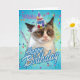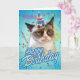 Este cartão apresenta Grumpy Cat usando um chapéu de festa, com "Feliz Aniversário" na frente.