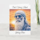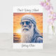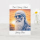 Um velho hippie engraçado ou um motoqueiro com barba longa e bandana na cabeça com o pôr do sol no fundo. Hoje, dia de aniversário, envelhecendo no cartão. "Não se preocupe em ficar mais velho, você ainda vai fazer coisas idiotas e divertidas, apenas mais devagar."