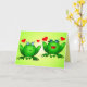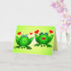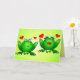 Um fofo casal de rãs de desenho animado manchadas de verde com corações de amor vermelhos, com votos alegres para um Feliz Aniversário! Por dentro, este cartão engraçado pode ser personalizado com sua mensagem pessoal, o nome do seu filho ou o que seu coração desejar. Design engraçado e fofo para amigos e familiares, crianças ou adultos, para o aniversário de um cônjuge ou filho, aniversário no escritório, ou personalize o texto para o Dia das Mães, Dia dos Namorados, aniversário de casamento, casamento ou chá de noiva; uma expressão divertida de amor e alegria para familiares e amigos, seu amor, uma criança especial, outro(s) ente(s) querido(s), um casal feliz apaixonado. O significado das rãs na espiritualidade inclui felicidade, humor, canto, música, celebração, sociedade ou comunidade, aumento do fluxo de dinheiro (as rãs são consideradas sortudas para o sucesso financeiro, e também o elemento Água); boa saúde, magia noturna, romance de conto de fadas. As rãs são associadas à saúde desde tempos antigos, quando xamãs usavam a pele sensível das rãs em rituais medicinais. Uma rã respira pela pele, e a falta de rãs em uma área pode significar um declínio na saúde ambiental. Muitas rãs indicam um ambiente feliz e saudável. Dê este design desenhado à mão a qualquer um que ame animais de desenho animado f