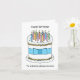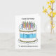 Uma imagem simples de um bolo de aniversário branco, com um arco azul amarrado em volta, acompanhada das palavras "Parabéns a um acupunturista especial".