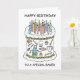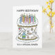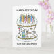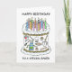 Um grande bolo de cartoon de aniversário coberto por velas luminosas multicoloridas e decorado com imagens de bolos, chapéu de cozinheiro, colheres, luvas de forno, um jarro medidor e um pino rolante.