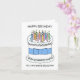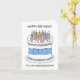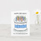 Uma simples ilustração de um bolo de aniversário branco, gelado, com um arco azul à sua volta, acompanhado das palavras "Parabéns a um motorista de ônibus muito especial".