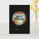 Um globo antigo colorido, fotografado contra fundo negro, é o tema do meu cartão de aniversário "Feliz Aniversário ao Melhor Amigo da Terra!". "Melhor Amigo" em texto preto na face do globo completa a imagem frontal do cartão.