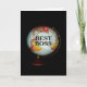 Um globo antigo de cor brilhante, fotografado contra fundo negro, é o tema do meu cartão de aniversário "Feliz Aniversário ao Melhor Chefe da Terra!". "Melhor Chefe" em texto preto na face do globo completa a imagem frontal do cartão.
