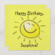 Cartaz de pérolas quadradas com a imagem de um sorridente sol amarelo em amarelo vivo e o sentimento personalizável "Feliz Aniversário, Sol!" As costas estão amarelas brilhantes com um sentimento personalizável que diz: "Você é o sol da minha vida. Que alegria te desejar Feliz Aniversário!" Veja o mala de favor correspondente, caixa de favor, etiqueta de favor, bolsa de presente grande e etiqueta. Veja toda a coleção de Convite de Aniversário nos CONVITES | Seção Convites e Cartões.