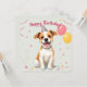 Celebrar um dia especial com este adorável design de aniversário feliz apresentando um cachorro fofo em um chapéu de festa com balões em um fundo de cinza macio. Perfeito para amantes de cachorros, crianças, ou qualquer um que goste de arte de aniversário lúdica e animadora. Este filhote encantador traz sorrisos a qualquer celebração.