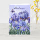 Flores de íris roxas com barba em tons de violeta e lavanda são apreciadas por lindas borboletas dançantes em um ambiente de jardim, em seguida, combinadas com uma adorável mensagem de desejos de aniversário escrita na língua espanhola. Que você receba tudo o que deseja neste dia especial é a mensagem.